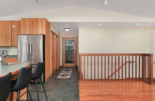 Relax with the whole family at this peaceful lakefront cabin! This cabin boasts an open layout with high-end designer furniture. Huge windows overlook the beautiful Sports Lake with snow capped mountains in the background. If you'd like to access the lake, you can walk right out the back door to the private dock where you can access kayaks or simply take in the lake on an adirondock chair. Inside, you'll find spacious bedrooms, an open layout, and all the modern amenities you could ask for!
