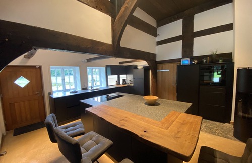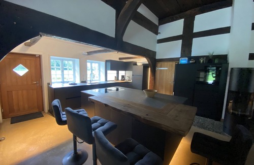 A BBQ grill and a fireplace are featured at this 7-bedroom, 2-bathroom rental. Bathroom amenities include a hair dryer and toilet paper. The kitchen is equipped with an oven, a stovetop, and a refrigerator, as well as a coffee maker, an electric kettle, and a microwave. Other amenities include an ironing board, heating, and a dining table.