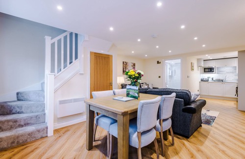 The ground floor is filled with natural light open-plan sitting and dining area with plenty of comfortable seating round the Smart television, and a wooden dining table with seating for up to four guests. The family shower room is on the ground floor and has a large walk-in shower.
