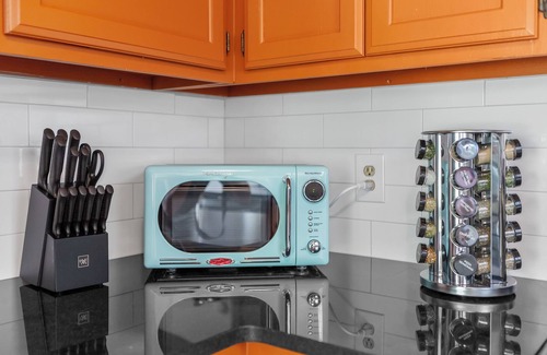 Sink into comfy seating, turn on the flat-screen TV for a Netflix binge, or simply enjoy the playful pops of retro décor. It’s the perfect balance of vintage charm and modern convenience.