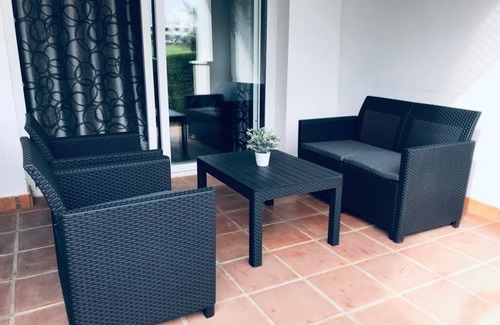Our apartment is furnished to an extremely high standard having been and enjoys fantastic views over the golf course. The apartment is in an excellent location being only steps away from a communal pool and a five minutes walk from the resort centre/golf practice areas. With air-conditioning and central heating the apartment is perfect for summer and winter holidays. A large covered terrace with garden is only steps away from the large communal pool. The terrace is furnished with stylish outdoor lounge set including table and sun loungers.