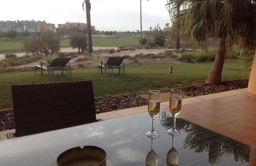 This is a fabulous ground floor apartment south west facing with amazing views over the 16th fairway on the Mar Menor golf resort.There are 2 bedrooms with 2 bathrooms one being an ensuite to the master bedroom. The apartment has been furnished to a high standard including television in the main living area, air-con/heating, free wifi. There is a lovely kitchen with breakfast bar and is fully equipped. Both bedrooms have wardrobes, chest of drawers, bedside units and mirror. The beds are zip and link and can provide single beds to king size beds. The apartment is situated on the exclusive 5* private golf resort which has 24 hour security and only ten minutes from the beach. The excellent on site facilities include golf course, golf school, club house, bars, restaurants, supermarket, tennis courts, paddle tennis courts, communal swimming pools. In the middle of the resort is the 5* Intercontinental Hotel with an excellent spa which is open to non residents. The hotel is a two minute walk from the apartment. Th apartment will suit, couples, groups of friends, families and golfing parties.