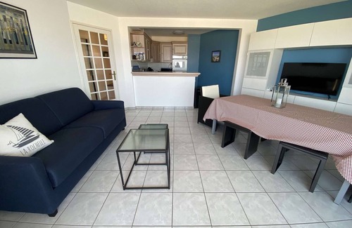 This apartment is composed of an entrance with cupboard, a living room with a sofa and a dining room, a kitchen area equipped with dishwasher, a bedroom with a double bed and cupboard, a cabin bedroom with a single bed 3 person bunk, a bathroom with washing machine, a toilet. Apartment equipped with electric heating, flat screen television. Balcony facing the sea with garden furniture. Private closed air parking n°14.