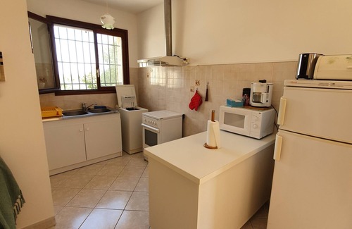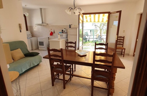 - a large dining room with kitchenette and sofa bed for 2, fitted cupboard to store all the necessary dishes, fridge-freezer, microwave, gas kitchen with oven, coffee maker, washing machine, television.
