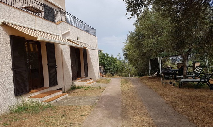 Garden level of a villa in a very large private property, planted with olive and fruit trees closed by an electric gate. The house being in height, we have a breathtaking view of the sea, the islands and sometimes Italy. Peace and tranquility guaranteed.
