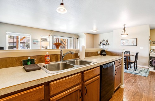 The open, ground-floor layout is well-furnished and tastefully appointed for unwinding at home after a day of adventure. A large, wraparound living room sofa is perfect for relaxing while streaming shows and movies on the flatscreen smart TV. A smaller, sofa/chaise offers a cozy nook for reading or an afternoon snooze. The full kitchen is ready for home cooking and comes equipped with a dishwasher for easy cleanup. The tidy dining nook offers seating for four. Enjoy morning coffee or evening cocktails on the private patio furnished with a two-seater bistro set. In-home essentials include free WiFi and a private washer/dryer.