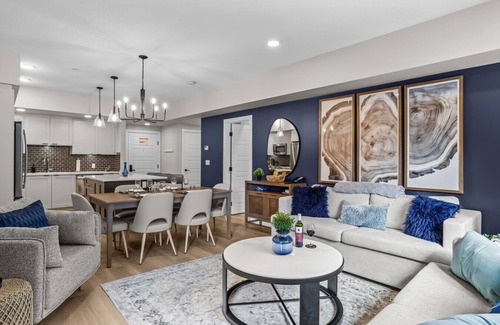 The open-concept living space is bright and inviting, featuring a fully equipped kitchen with stainless steel appliances and all the essentials to prepare your favorite meals. Enjoy dining together at the spacious table or relax on the cozy living room couch, complete with a large smart TV for streaming your favorite content. Smart TVs are also included in both bedrooms, ensuring everyone has access to entertainment. Tasteful artwork throughout the space adds a warm and welcoming ambiance.