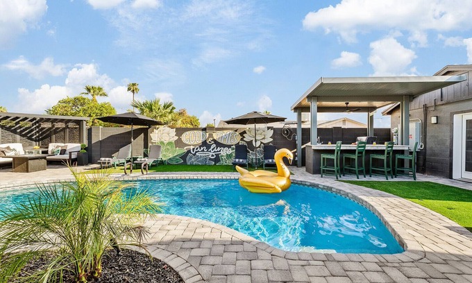 Group Fun HQ with Hot Tub + Bar, Heated Pool, Game Room & Lounge Near Old Town is located in New Papago Parkway. Group Fun HQ with Hot Tub + Bar, Heated Pool, Game Room & Lounge Near Old Town provides accommodation, featuring Entertainment, Barbecue/Outdoor Cooking, Pool, among other amenities. This House features Entertainment, Barbecue/Outdoor Cooking, Pool, to make your stay a comfortable one.