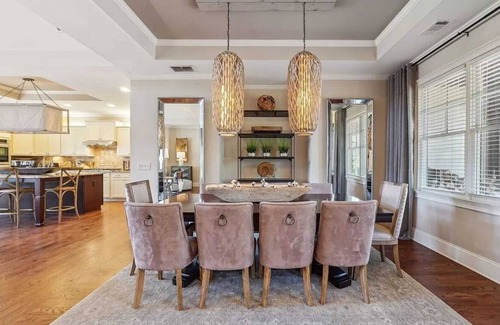 This Big Canoe group home sits on a greenbelt of mountain meadow protected forest with paths and hiking just out the front door. Accommodating up to 18, this house is a step above the typical home rental with professionally designed interiors and a fabulous game room and outdoor entertainment area complete with a hot tub, fire pit, corn hole, bocce, giant jenga, darts, and more!