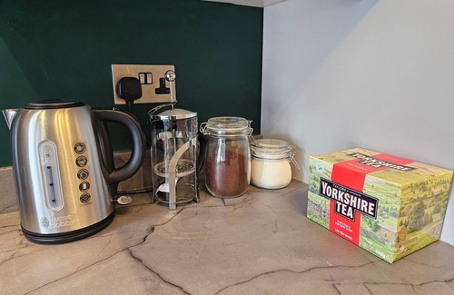 Fully equipped kitchen: oven, microwave, fridge-freezer, toaster, kettle, cafetière, and all cookware essentials