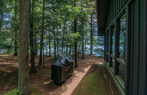 Grouse House is a roomy lakefront camp, built for multi-generation fun, with ample bedrooms, and dining spaces indoor and out. A large stone fireplace centers the living space, which is tiled and pine-paneled. Amenities include a shared dock for boating and swimming, a screened porch and a patio at the lake's edge.