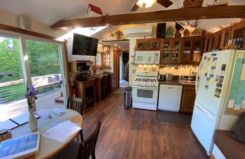 Guests staying at our vacation cottage are able to enjoy a furnished bedroom, bathroom, kitchen, and dining/lounging space. As well as exclusive access to the pond (no fishing), kayaks, dock, hot tub, fire pit, and large deck with a grill!