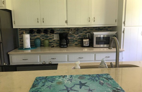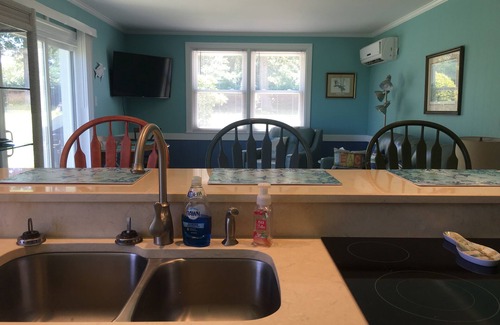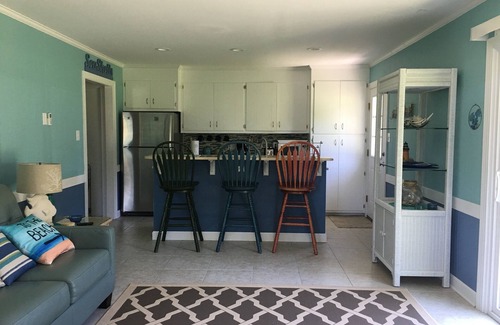 The one bedroom guest house is located 300 feet from the beach. There is a dock, kayaks and life vests included in your stay. The house includes an open kitchen and living area. There is a queen size sleep sofa in the living area with a television and games. The kitchen includes a full size refrigerator, oven, microwave, coffee maker and dishes. The bedroom has a king size bed and a walk-in closet. A twin size foldout bed is available upon request. The bathroom has a shower and cabinet space. Sheets, bath towels and beach towels are also provided.