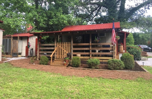 The french doors in the great room lead out to a large patio, perfect for breathing in the fresh mountain air, enjoying morning coffee or relaxing with a glass of wine in the evening under the rustic tin roof (and the outdoor ceiling fan for those warm southern nights). We created this outdoor living space from the former stables where our horses were kept. It is furnished with a table for 4, cozy sitting areas and a hammock for those mid afternoon naps or curling up with a good book. we have also added a new hot tub with fun lights and a waterfall. Our guest can stream music, work on laptops or surf the internet outdoors as the wifi works great indoors and out. A gas grill and is located on the patio. A fire pit with wood provided is a few steps away from the cottage. this patio is not dog proof and dogs must be attended by their humans at all times.