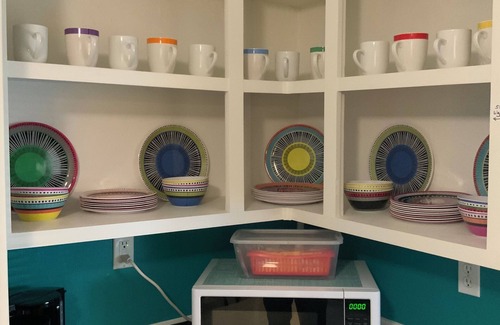 We supply a fully stocked kitchen for those visiting family that want to host that includes crock pots, mixing bowls, mixer, bakeware, and plenty of plates, drinkware, and silverware.