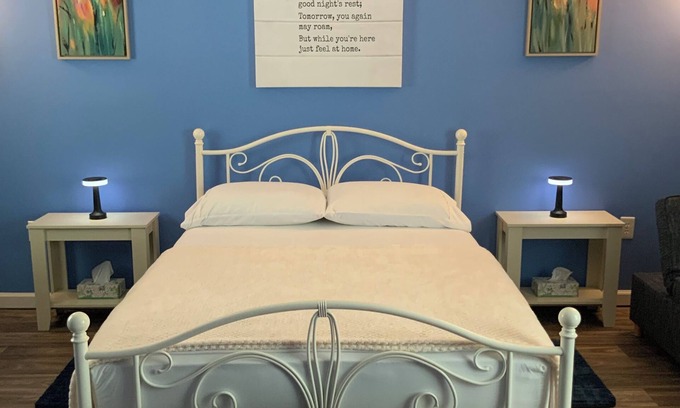 Main bedroom has one full size quality platform bed with 10" firm Hybrid mattress, and quality bedding and blankets; extra pillows and blankets; convertible lounger that can double as a small bed to keep little ones close by; a work station; wall mount Smart TV w/ Prime Streaming; plenty of closet space w/hangers and shelving; ironing board /iron, for extended stays.