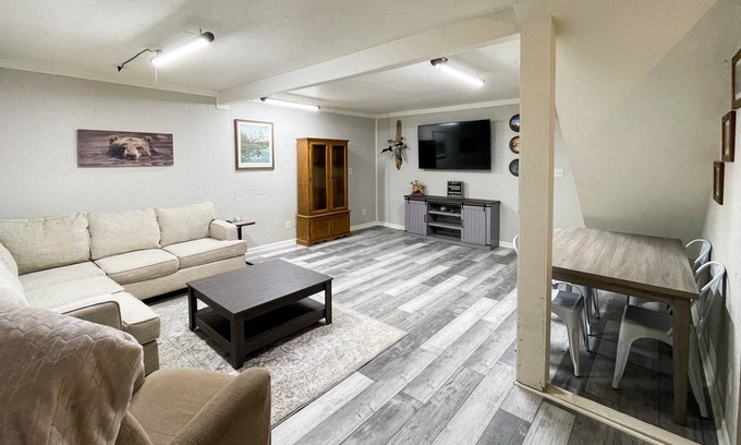 Guest house with spacious shop located on a peaceful street in between Discovery Park and Reelfoot Lake. The guest house features 5 twin beds and a sectional couch for maximum comfort, a 65" TV, a full kitchen and a full bathroom. The climate controlled shop is right across the way and is the perfect hang-out destination for after hunting or family get togethers; featuring a pool table, darts, corn hole, ping pong, a jukebox, an 86" TV, a 20ft bar, a grill, and access to indoor parking all year round.
