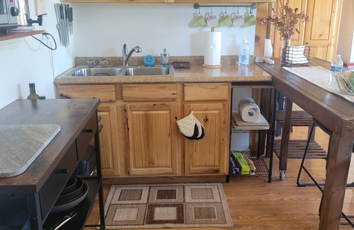 Stay comfortably just outside of Silverton at Buena Vista Lavender Farm. The primary room in the Guest House features a queen bed and a sofa bed, perfect for a small group of guests. Enjoy the serene surroundings and the gorgeous views from the patio, or take a walk on the nature trails winding throughout the property. With amenities like a kitchen, outdoor grill, contained fire pit, heating, AC, and WiFi, your stay will be comfortable any time of year. The bathroom includes a shower and a hair dryer. The kitchen features an induction cooktop, full-size fridge, toaster oven, coffee maker, cookware, and dishes. We also provide towels, toiletries and basic kitchen essentials.