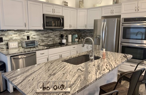 First Floor: Open concept main with stunning fully equipped kitchen featuring microwave, cooktop, double oven, toaster, Keurig, electric kettle, pots/pans, utensils/silverware, plates, bowls, drinking/wine glasses, solid countertops, and breakfast bar island with seating for four. Family room offers a large sectional sofa with chaise and 65" Smart TV. Powder room on main for your convenience.