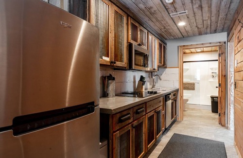 The guest house studio apartment is the perfect addition to The Bunkhouse home. The galley kitchen with full sized fridge, stove top range, microwave, and studio sized dishwasher makes it so everyone in your party has access to prepare their meals separately or together. The guest house bathroom is extremely well equipped with a walk-in shower and antique farmhouse style sink. The living room is beautifully decorated and accented with repurposed lumber. You will find plenty of seating to relax and enjoy the gas fireplace and large flatscreen TV. In the morning you can brew some coffee at the coffee station where you will find a dual-purpose Keurig pod/standard drip coffee maker. Enjoy your meals at the dining table with seating for 6 or grab a quick bite at the breakfast nook with seating for 2. Upstairs you will find the sleeping loft equipped with 2 queen beds and 1 twin, with additional sleeping available in the living room using the sleeper sofa.