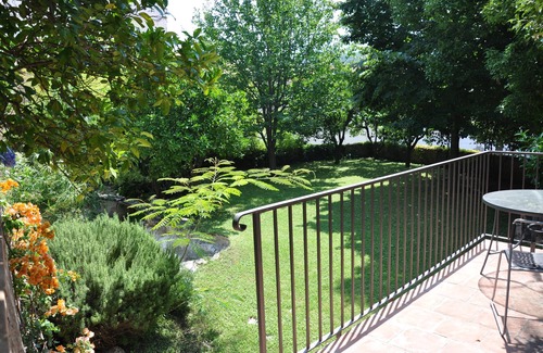 The manor, built in the mid nineteenth century, shoulders the medieval castle of the Lancellotti That dominates the old town center. The guest house, separated from the house by a paved courtyard, gives onto a verdant garden shaded by tall trees. Beyond the garden and the rooftops there is a view across the valley towards the steep rise of a mountain range. Even though the residence is a stone's throw from the central square, it is a realm of tranquility without any through traffic and the faint murmur from the square below is hardly audible over the birdsong. The outhouse is open plan with two separate sleeping areas in the mezzanine. Outside looking onto the garden, there is a patio ideal for enjoying your meals in the open air. A perfect retreat for alternating days of relaxation with busy sightseeing and cultural tours.