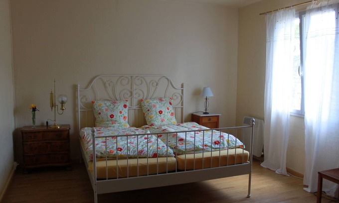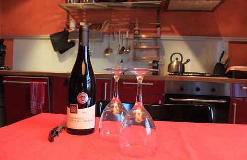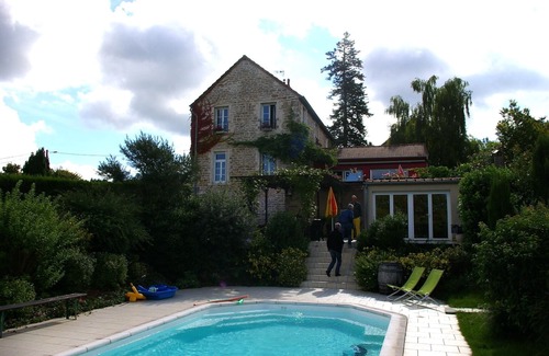 Living room with fireplace and big screen tv/dvd & wifi, dining area and fully equipped kitchen. Large bedroom with beds for 6. Bathroom with new shower, washing machine and dryer. Tile floors throughout. Private patio overlooking the vegetable garden with view to the Canal du Centre. Shared pool and summer kitchen featuring a pizza oven and gas grill. Guests enjoy the use of bicycles, fishing poles, table tennis, croquet and more. Daily bread service available.