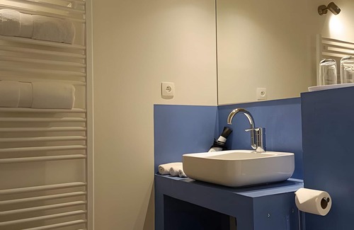 Also located on the courtyard, this room is not suitable for tall people or those with mobility issues, as the sleeping area is on a mezzanine. Equipped with a 140 x 190 cm bed, it is perfect for a single person or a tall child. The room also offers a living area with a functional white lacquered sideboard, providing a comfortable space for a pleasant stay. The bathroom includes a shower and a toilet.