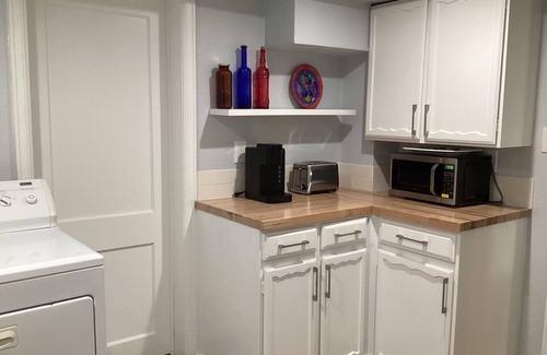 This suite provides a private guest entrance, a fully equipped kitchen, and a washer/dryer for convenience. Additionally, guests can enjoy shared outdoor space featuring a grill.