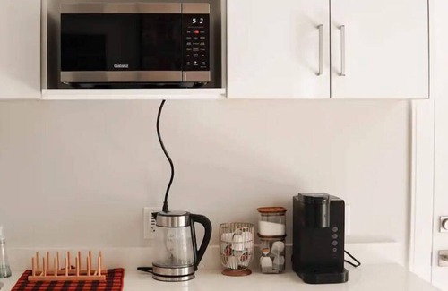 The small appliance kitchenette area is equipped with a fridge, coffee machine, kettle and microwave.