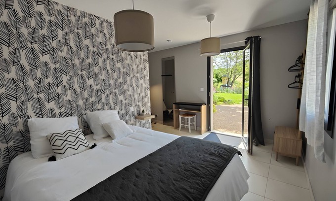 The Graphique Room, accessible without steps and located in Chozeau, offers a beautiful view of the surrounding hills. This 20 m² room includes a sleeping area and a bathroom, accommodating up to two people. You also have high-speed Wi-Fi suitable for video calls, air conditioning, and a fully equipped kitchen accessible from outside (dishwasher, refrigerator, conventional oven, microwave, small appliances, raclette set, waffle maker, etc.). The accommodation also offers you a private outdoor area with a covered terrace and a fire pit.
