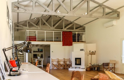 Originally the farm tools depot, the GuestHouse is the outcome of a recent renovation that transformed the previous warehouse in one large open space with mezzanine, full of light, which can now accommodate up to four people. The original concrete truss-beams together with the natural wood flooring create an industrial and modern environment, yet very cozy thanks to the huge tile stove and to the selection of reclaimed interior objects blended with contemporary design elements. The dwell is solar powered and heated by the wood burning tile stove. It features a small kitchen complete with all appliances, accessories and tableware, a disabled accessible full bathroom with shower, a half-service bathroom, a queen size bedroom at mezzanine level plus another bedroom with two single beds on the main floor.