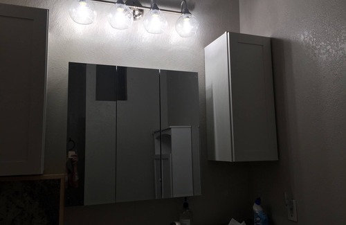 Bath has newly updated with led lighting, great cabinets and a washer and dryer combination that saves space and is so quiet!!