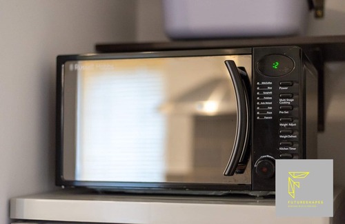 The adjoining kitchen is fully equipped with essential cookware and cutlery, including an electric stove, an oven, and a microwave, to whip up a delicious meal.