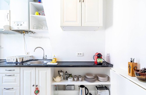 The kitchen is fully equipped with essential cookware and cutleries that you'll need to cook delicious meals, such as a stove, an oven and a microwave.The apartment also has a washer and ironing equipment for your laundry needs.