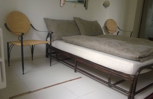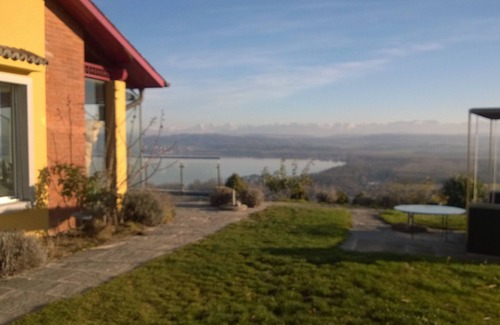 The room is part of a villa amidst a garden with old trees, a large lawn with panoramic view on the Swiss Alps, the plain of the river Broye and the lake Murten. The guest-room has a private terrace with lakeview, access to outdoor 5m-SwimSpa, a whirlpool with jets to swim counter current heated all year, private parking, WIFI, flat screen TV, choice of tea, coffee (Nespresso), bed-linen & towels, borzois on site.