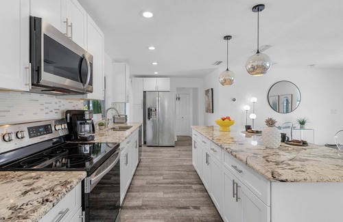 Gourmet Kitchen: Cook with ease in the fully equipped kitchen, complete with modern appliances, granite countertops, and a breakfast bar—perfect for casual dining or preparing a feast for family and friends.