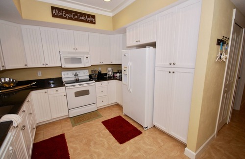 The condo is comfortably furnished and has a king bed in the master bedroom, which features a large master bedroom window overlooking the serene Gulf of Mexico. The master suite has a jacuzzi tub, shower, his/her vanities and toilet room. The second bedroom features a queen size bed, and the third bedroom is furnished with a set of twin bunk beds. The large, well-stocked kitchen has everything you need to prepare your catch of the day.