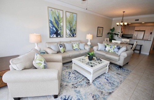 This condo is comfortably furnished and has a king bed in the master bedroom, which features a large master bedroom window overlooking the serene Gulf of Mexico. The master suite has a jacuzzi tub, shower, his/her vanities and toilet room. The second bedroom features a queen size bed, and the third bedroom is furnished with two sets of twin bunk beds. This bedroom connects to a bathroom that is shared with the rest of the condo. The large, well-stocked kitchen has everything you need to prepare your catch of the day.