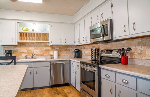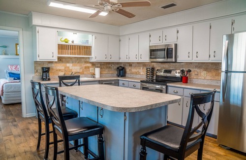 and cookware needed for a family of 11. The center island is great for food prep and offers comfortable seating for 8.