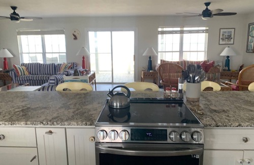 This four bedroom home has a large open concept living area. We have plenty of kitchen space to put everyone to work and not miss the view. Bring your fresh catch into our newly renovated Kitchen and take advantage of the many spices available in this Chef's kitchen Or relax on one of the two porches. You choose - bay or beach view.