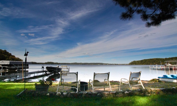 Lakeside boathouse located on a quiet bay of Gull Lake. Only forty feet from sandy beach, great swimming. Panoramic view of Pike Bay. Two championship golf courses including restaurants within three miles. Access to numerous restaurants by boat.