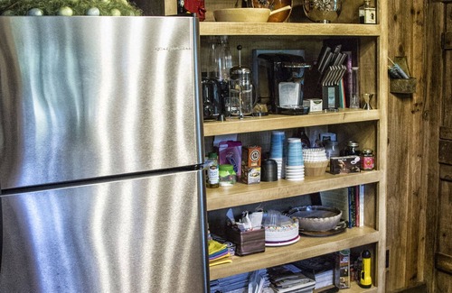 The bathroom has a slate tile floor and slate tile shower with stained glass in the window of the shower and above the sink. There is a washer and dryer in the event that you need those items. We supply a hair dryer and linens and towels for your needs. We also supply shampoo, soaps, Tide, charcoal for grilling, etc., just like your home. We stock the pantry with condiments and other foodstuffs for your use.