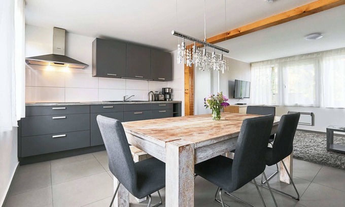 Our vacation home 7 can accommodate up to 5 people and is ideal for families, couples or small groups. It has two bedrooms, a fully equipped kitchen with adjoining dining area and a modern bathroom. The cozy living area invites you to relax with a sofa bed and an indoor fireplace. TV and WiFi are available for entertainment, so there is no lack of comfort. Enjoy the quiet location and the comfort of this lovingly furnished vacation home - perfect for relaxing days in nature! We look forward to welcoming you!