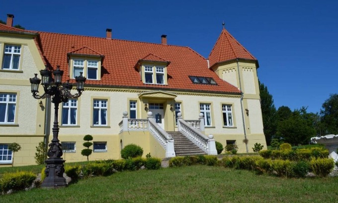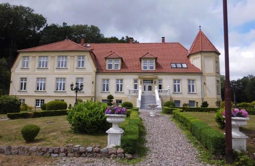 The manor house with its turret, dormers and vaulted cellars was built in the classical style. It is elevated on a wooded hill and offers from the upper floor a magnificent view over the fields to the Baltic Sea.