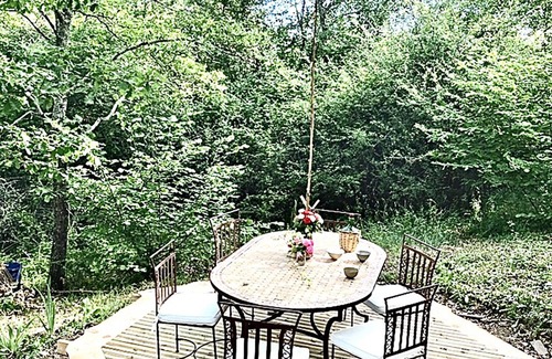 Under the shade of the oak trees is an octagonal outdoor deck with a beautiful moroccan table set inviting you to soak in the sunset with a glass of wine, enjoy a meal or even grill some local meat and veggies.