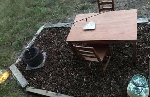 with crockery, cutlery and cookware. It also has a gas hot plate and dining table with 2 chairs and a small wood burner for the cooler months. It has solar lighting and phones can be charged.