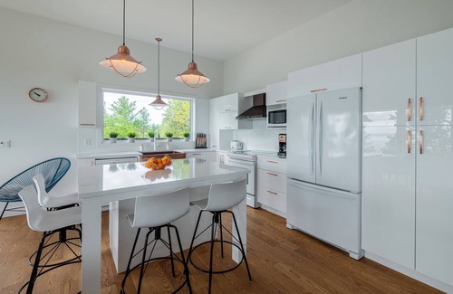 Large all-white kitchen with large quartz countertop, perfect for cooking with family or friends and gathering for an aperitif.