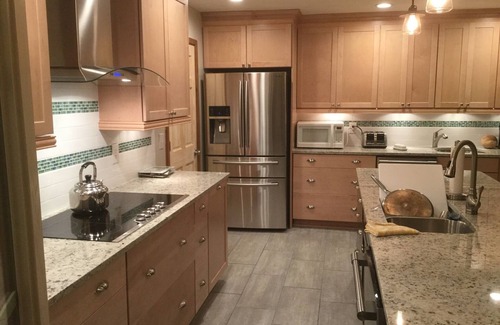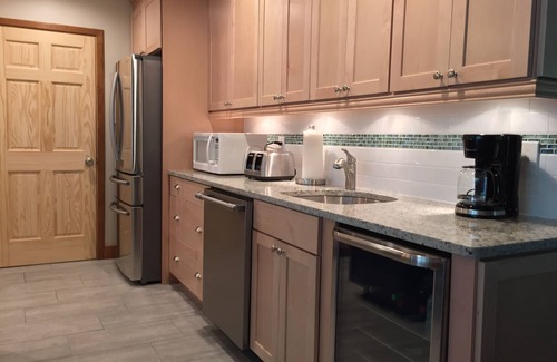 The adults enjoy this Main level of the house. The living room boasts a wood burning fireplace (available when outside temperatures are 50 and below), the 72" Sony Bravia high definition TV coupled with the Sony Bravia home theater surround sound system, Amazon FireSticks for streaming TV, cloth and leather furniture. The kitchen is open concept allowing the cooks to remain involved with the action in the living room, or friends may join the cooks by sitting at the kitchen four-seat island.