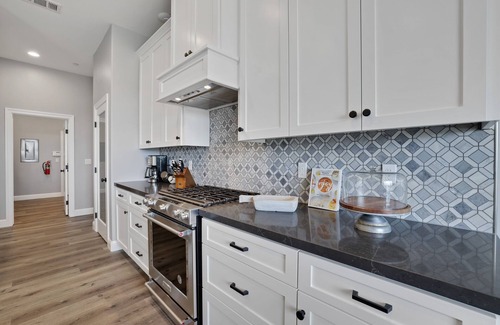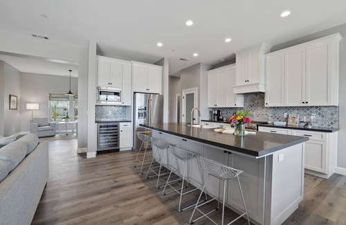 Known as Rivera, this home is located on the northeast corner of the Estate near the Bocce Ball court, horseshoe pit, and basketball hoop. This beautiful new home is decorated in grey tones with contemporary furnishings and finishes. The Main Bedroom has a north facing window and an En Suite Bathroom. The two other guest bedrooms have north and south facing windows. A pull down Murphy bed, located in the common area of the front entry provides additional sleeping accommodation for two. The great room kitchen and family room is the perfect place for family and friends to gather and enjoy the beautiful views of the surrounding vineyard. The kitchen is fully stocked with serving ware and utensil service for 8 including basic pantry staples as listed in the amenities link. Amenities for children include a portable crib and sheets, highchair, and dishes. There is a private fenced yard and patio with a dining table for al fresco meals off of the great room. The attached two car garage with EV chargers is available for your private use and there are also two additional dedicated parking spaces outside. The home is powered by solar energy. Rivera has a full laundry room with supplies. All bed linens and towels are provided. Starter quantities of soaps and paper goods are provided for you and your guests.