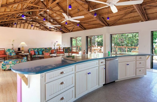 Hale Ke Alaula, a large 2 bedroom, 2 bath home, has enormous square footage, vaulted bamboo ceilings and a huge wrap around deck. Comfortable furnishings, top of the line appliances, gourmet kitchen and Air Conditioning! There is a king size punee on the downstairs patio…if you have a couple of teenagers that want an outdoor sleeping experience in Hawaii!